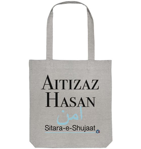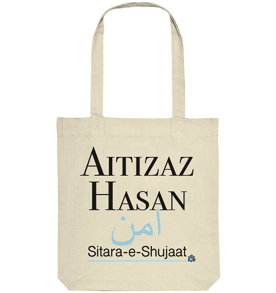 Die Tasche besticht durch ein kraftvolles Design mit dem Namen „Aitizaz Hasan“ in einer eleganten Schrift. Ein harmonisches Zusammenspiel aus Weiß und Blau vermittelt Frieden und Entschlossenheit.